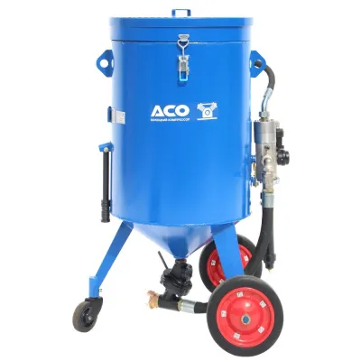 Аппарат струйной очистки АСО200 состоит из ресивера, образующего рабочую камеру аппарата, загрузочного бункера с сеткой, дозатора абразива, напорного рукава и блока управления.