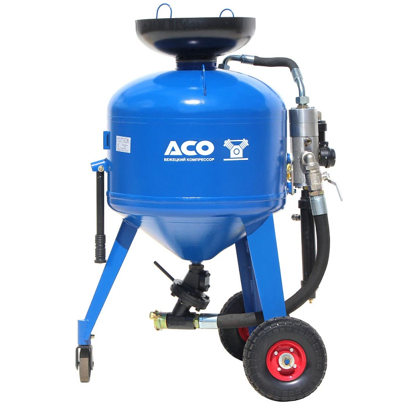 Аппарат струйной очистки АСО150 Бежецкого завода АСО характеризуется производительностью по очистке поверхности до 37 м²/ч. Расход сжатого воздуха 4...10 м³/мин, рабочее давление 7...10 атм. Расход абразива 15 - 40 кг/м², объем камеры 150 л, размеры установки 96 х 81 х 125 см, масса 150 кг. Длина напорного рукава 10 м.